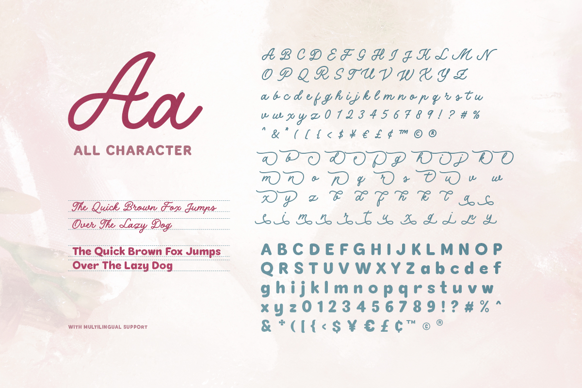 Your Dreams is a soft font duo that have bold rounded sans and curly monoline script. With cute and retro looks, you can use this font for any purposes such as book cover, logotype, quotes, branding, and wedding invitations card. The script contains alternates that will make your project looks stunning. You can add the end swash by activating ligature then type equal + number (1-3), for example “Dream=3′. This font duo also support multi language.